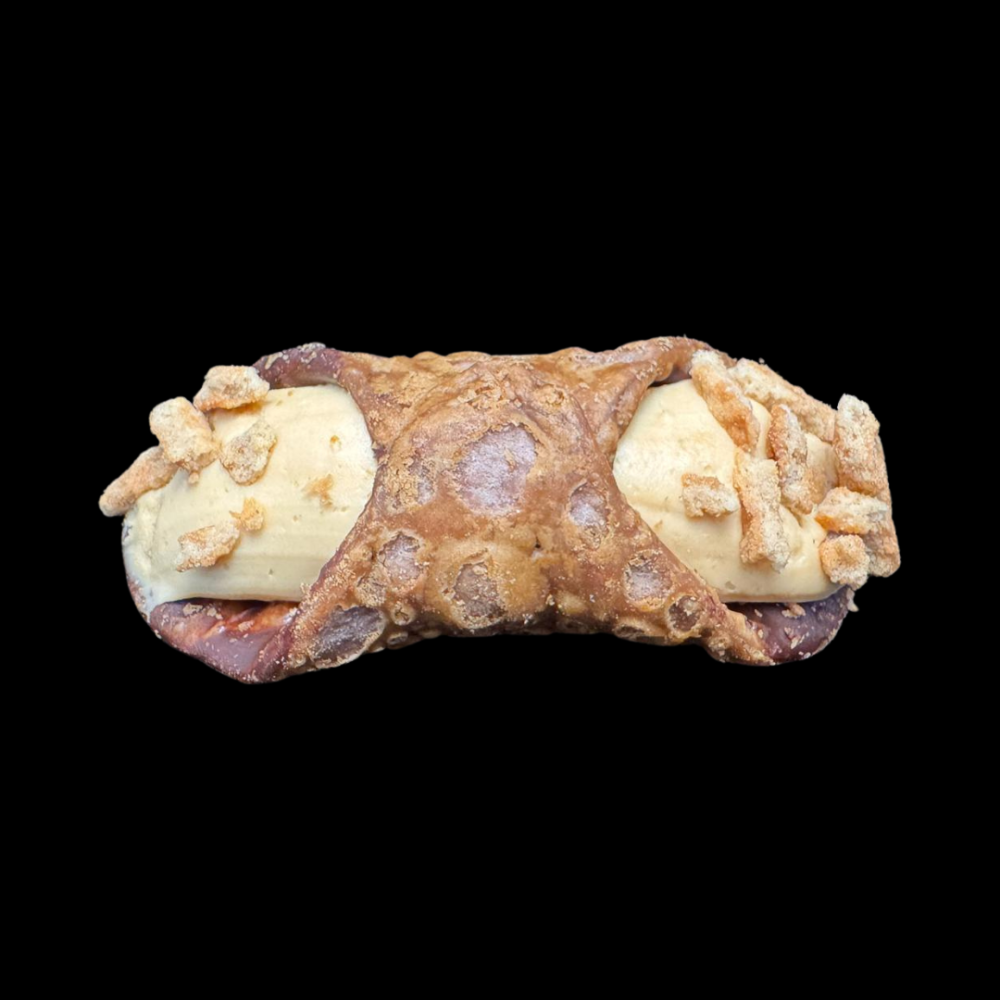De Cannoli stroopwafel combineert de smaak van een echt Hollandse klassieker met de Siciliaanse traditie. De zachte karamel wordt afgetopt met stukjes stroopwafel.