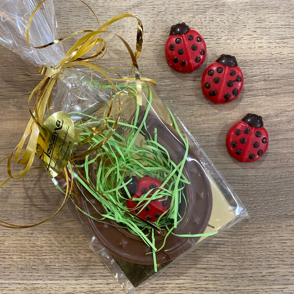 Wens iemand geluk met een hoefijzer van heerlijke melkchocolade! In het hoefijzer zit een lieverheersbeestje voor nog 'n beetje extra geluk!